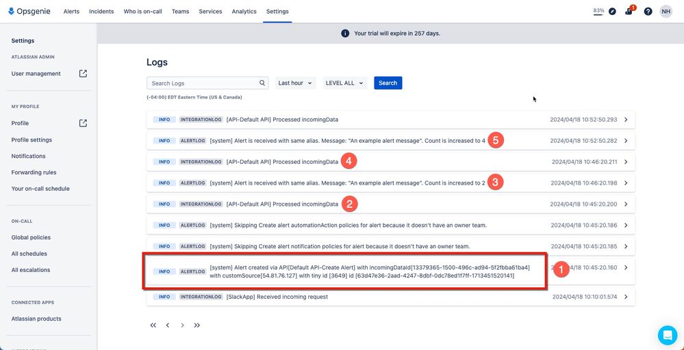 Specifically reviewing the Logs tab within your Opsgenie. There you can check whether or not Opsgenie is receiving the requests from LM. If Opsgenie is receiving the requests, the test alerts could be created through the Default API integration as mentioned above instead of the LM integration.