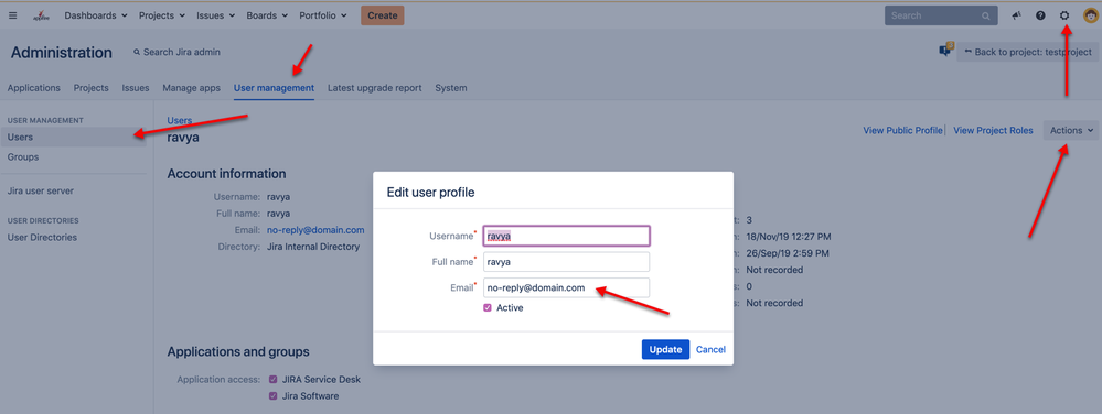 Login as Jira admin/site admin, navigate to Cogwheel-> User management--> Users and select the user where you u can see the Actions option under which you can edit details(Email).