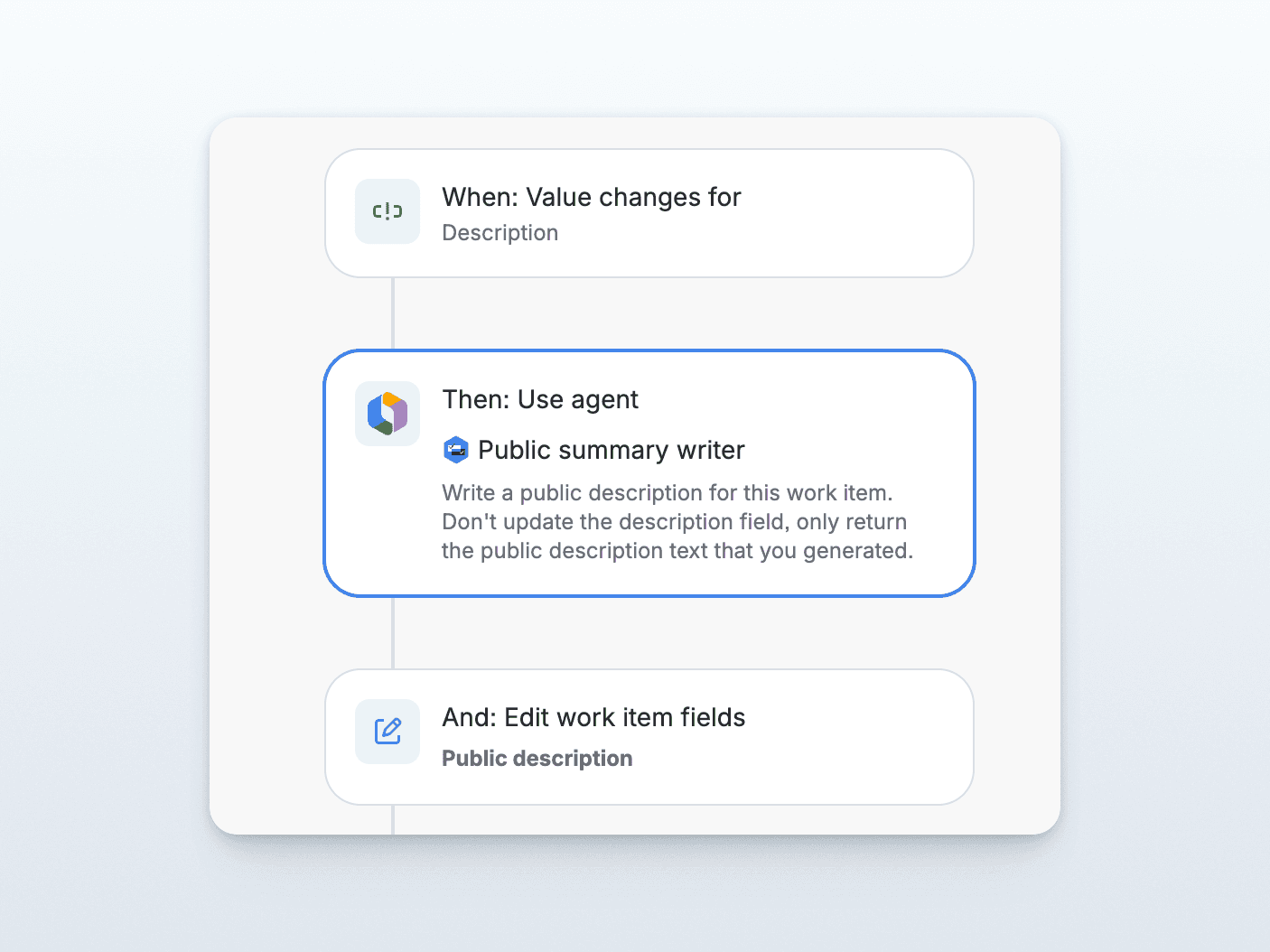 ⚠ Note: While the agent setup includes instructions to write back to the public description field, Rovo currently cannot update Jira fields directly via Automation. That step will be handled in the automation rule.