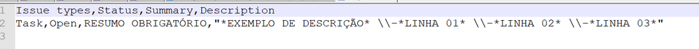 Deixei abaixo um exemplo. com issue type, status, summary e description, usando o separador vírgula.