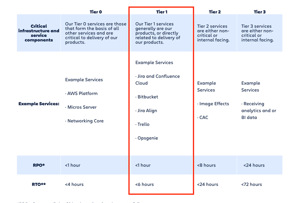 When I look at the support policy (https://confluence.atlassian.com/support/atlassian-support-offerings-193299636.html) it also states that "We have separate support offerings for Jira Align, Opsgenie, and Statuspage" and links out to the StatusPage product page which just has the different support plans but doesn't mention anything about RTO and RPO. I know the product is highly available however looking for a definitive answer on the RTO and RPO values. I note this question was asked previously in the forum and it points to the data management page but as previously mentioned it does not outline what tier StatusPage fits in to in order to be able to work out the RTO and RPO.