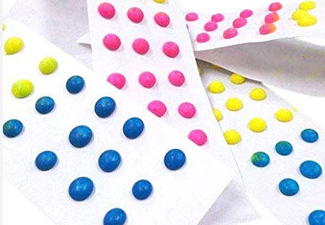 When I was little I loved these candy dots/buttons. You rip them off the paper and eat them. As an adult it does not sound appealing but as a kid the novelty of picking paper off your candy was fantastic. Each color had a slightly different flavor but I honestly don't remember. I'm sure it was pure sugar and food dye.