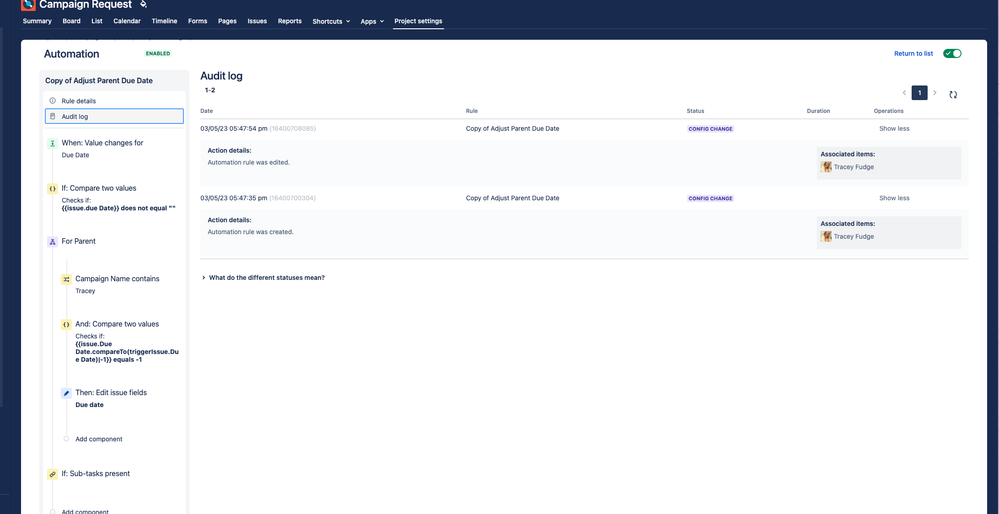 I made the change, adjusted the date in the child issue, but the parent date did not change.  Also the add value to audit log is not displaying in the log.Screenshot 2023-05-04 at 9.32.04 AM.pngScreenshot 2023-05-04 at 9.33.04 AM.pngScreenshot 2023-05-04 at 9.34.14 AM.png
