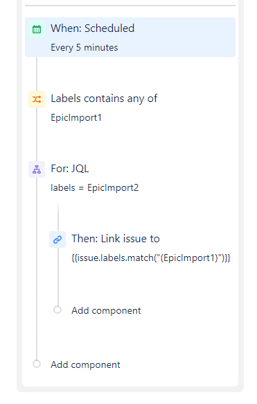 If I try this last step with just an issue key the rule runs successfully so I believe I have a syntax issue with how I'm trying to grab the epic in the final step. I'm currently using {{issue.labels.match("(EpicImport1)")}} to try to grab any epic with the label EpicImport1.